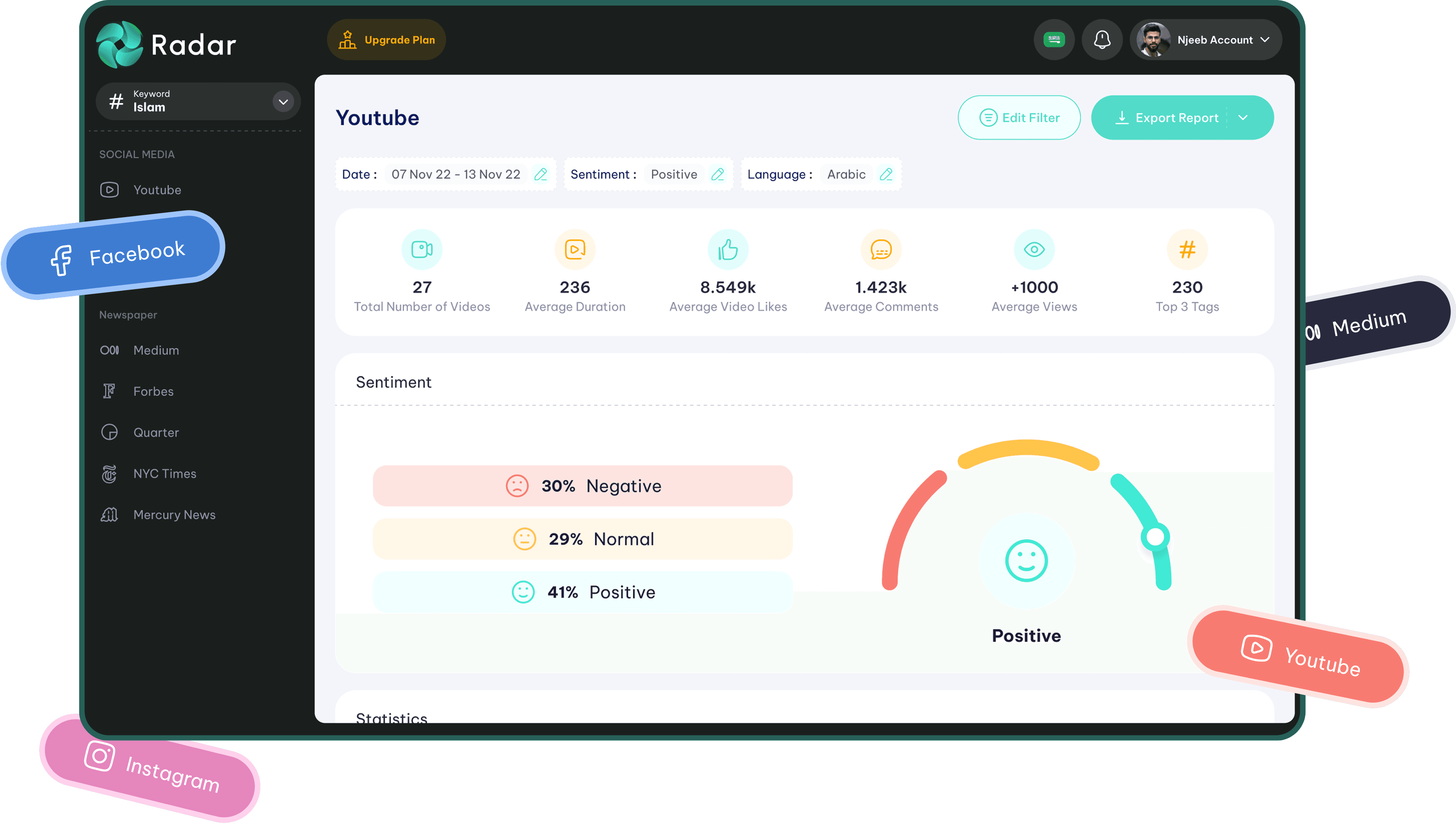 Advanced analytics to support dawah with informed, data-driven insights, Radar equips you with intelligent tools to monitor and analyze Islamic-related content across digital platforms. It helps individuals and organizations understand audience trends, enhance their outreach strategies, and deliver meaningful messages to wider communities.